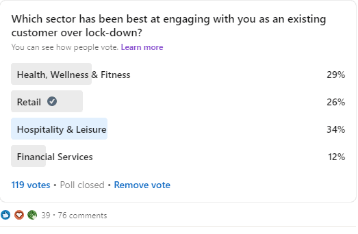 And the winner for the best engagement in Lockdown goes to ……. drumroll 🥁 Please vote and let me know great examples in the comments. Communicating and connecting during lockdown is a win-win commercially and for customers.